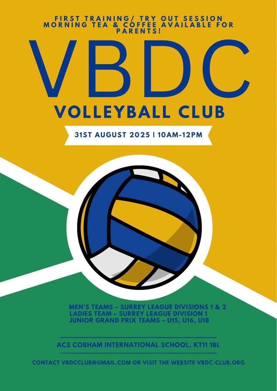 As the new season approaches we will be holding a tryout session initially for our teams which will be competing in the Surrey League as well as National Age Group competition s. Book a place from the Training page. VBDC 2024-25 Club Tryouts Sun, 1 & 8 Sept 2023, 10:30–12:00 BST ACS Cobham, Portsmouth Road, Cobham, UK